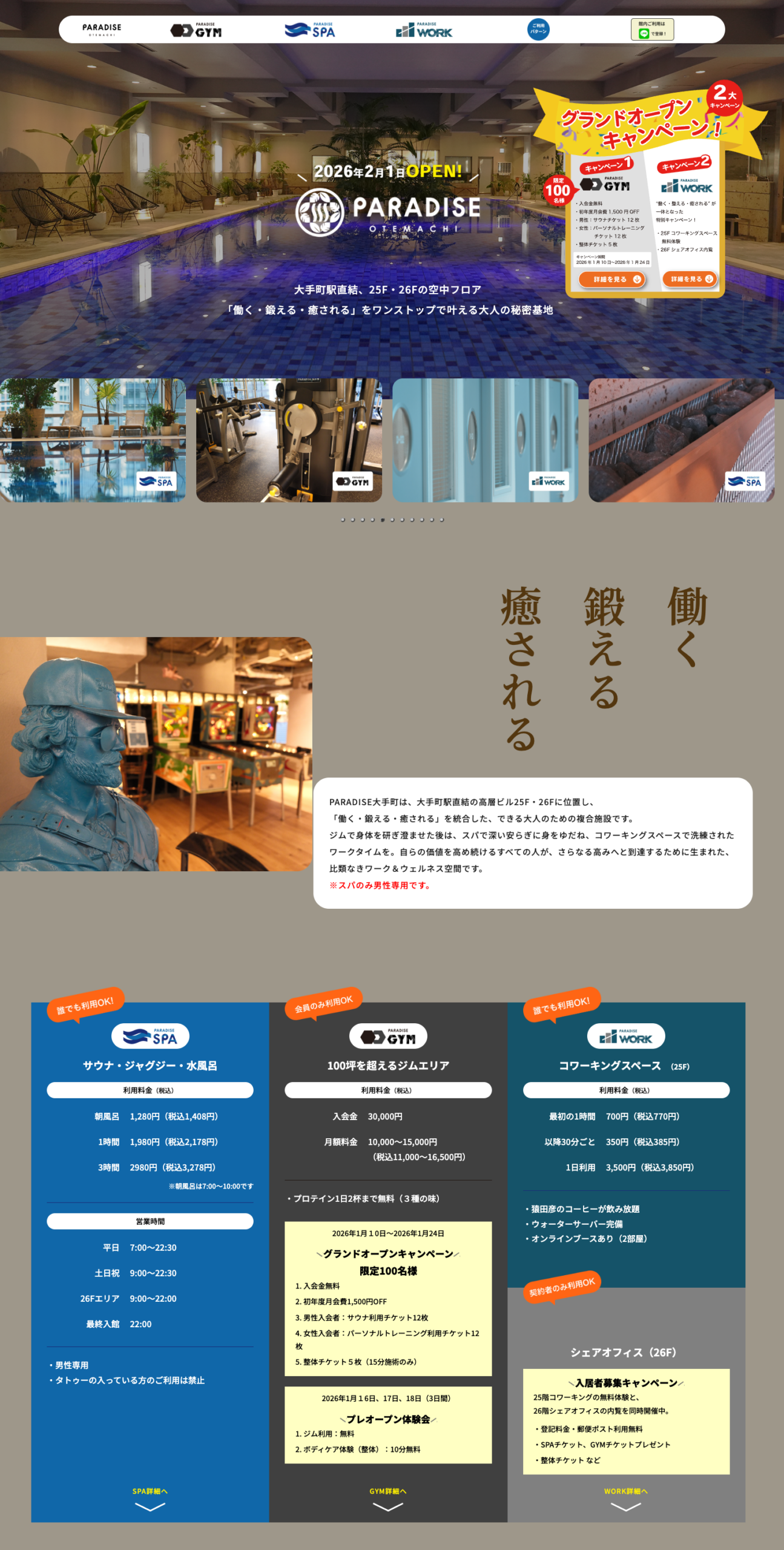 ご依頼前のHPの課題/制作依頼の背景 大手町の中心に位置するビルの最上階に、2026年2月オープン予定の複合施設です。スパ、スポーツジム、シェアオフィス、コワーキングスペースを備えており、今回はその中でもフィットネスジムの会員獲得を目的としたLP(ランディングページ)制作のご依頼をいただきました。