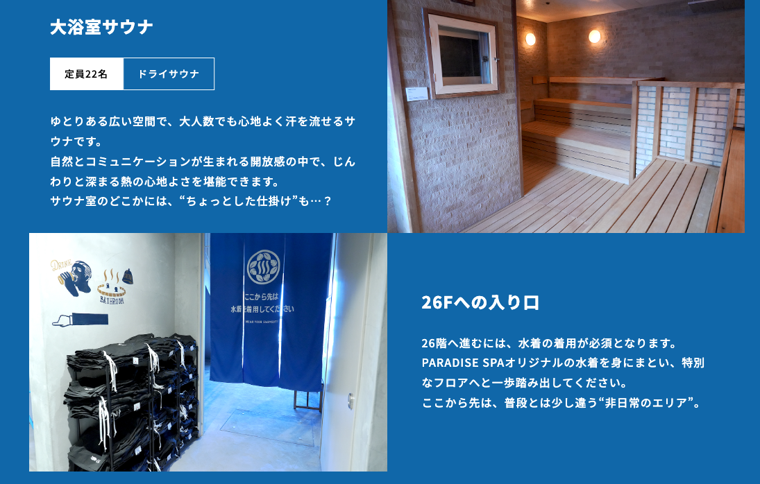 26Fへの入り口がお気に入り。レンタル水着を履いて大きな水風呂にザブーンなのだ!